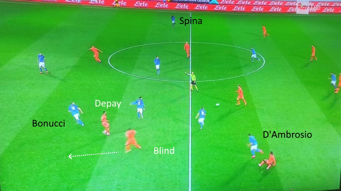Tuttavia, come abbiamo detto prima, l’Italia è stata meno reattiva del solito, sia nell’aggressione che a palla persa: arrivava sempre con qualche tempo di ritardo. Non funzionava la riconquista tanto cara a Mancini. Con D’Ambrosio spesso sopra la linea della palla, l’Olanda trovava molti varchi su quel lato. Blind, l’esterno sinistro del 3-5-2, era sempre tempestivo ad aggredire la profondità alle spalle del giocatore interista. Così sono arrivate diverse situazioni pericolose.