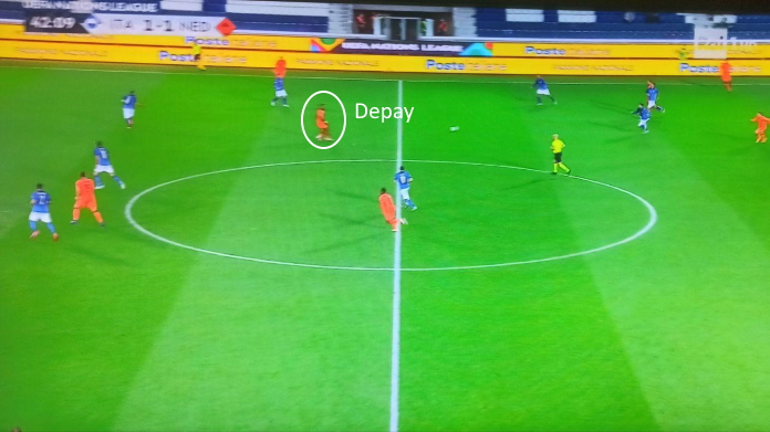 Una delle molte situazioni in cui Depay riceve liberissimo tra le linee. L’Italia concede spazi in mezzo, nessuno accorcia su di lui.