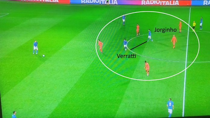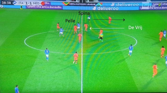 A Bergamo, l’Italia ha fatto più fatica nel consolidare il possesso. De Boer ha infatti predisposto una vera e propria gabbia nei confronti di Verratti e Jorginho, che rendeva difficile per i difensori arrivare a loro. Le punte (Depay e De Jong) schermavano i mediani, con alle spalle i centrocampisti oranje pronti ad accorciare.