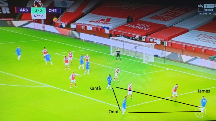 Un esempio qui, la classica azione offensiva del Chelsea. Triangolo tra ala, interno e terzino. In questo caso, il palleggio è troppo lento: i blues non riescono a mandare nessuno al cross. L’Arsenal è corto e compatto, protegge bene l’area