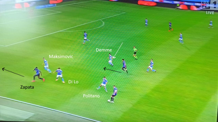 In maniera simile a quanto successo contro il Sassuolo, Gasperini voleva fare defilare Zapata a sinistra per consentirli di puntare Maksimovic in campo aperto: l’idea era quella di mandare Di Lorenzo fuori posizione (facendolo attirare da Gosens) e lanciare il colombiano in profondità. Il Napoli era però sempre accorto e compatto, quindi – tranne in una singola circostanza a inizio gara – Zapata non ha avuto spazi per sfruttare questa situazione.