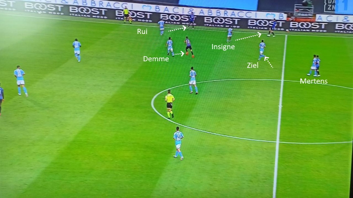 Per arrivare nella metà campo avversaria, ha utilizzato soprattutto i terzini. Gosens e Castagne rimanevano bassi poiché attirati da Insigne e Politano. Di conseguenza, Di Lorenzo e Mario Rui avevano tanto campo per ricevere e alzare il raggio d’azione. Su di loro uscivano Toloi e Djimsiti, ma sempre con qualche tempo di ritardo.