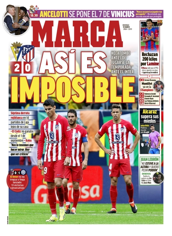 L’Atletico Madrid di Simeone cada contro il Cadice e sui quotidiani parlano della sfida contro l’Inter