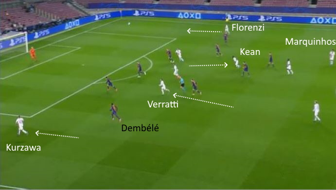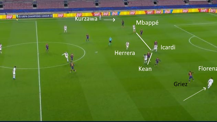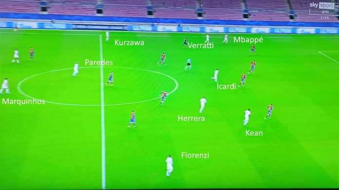 Per bucare le linee rivali, il PSG è stato molto bravo a innescare Kurzawa e Florenzi alle spalle della retroguardia catalana.