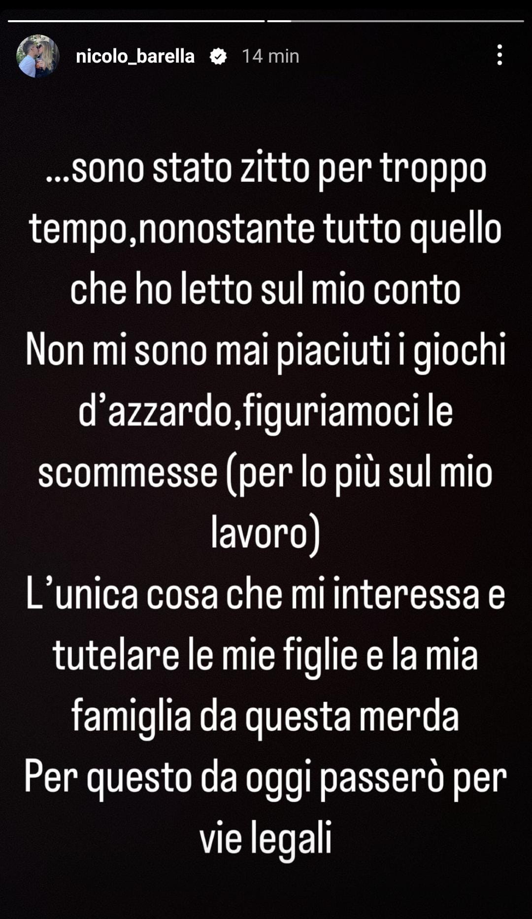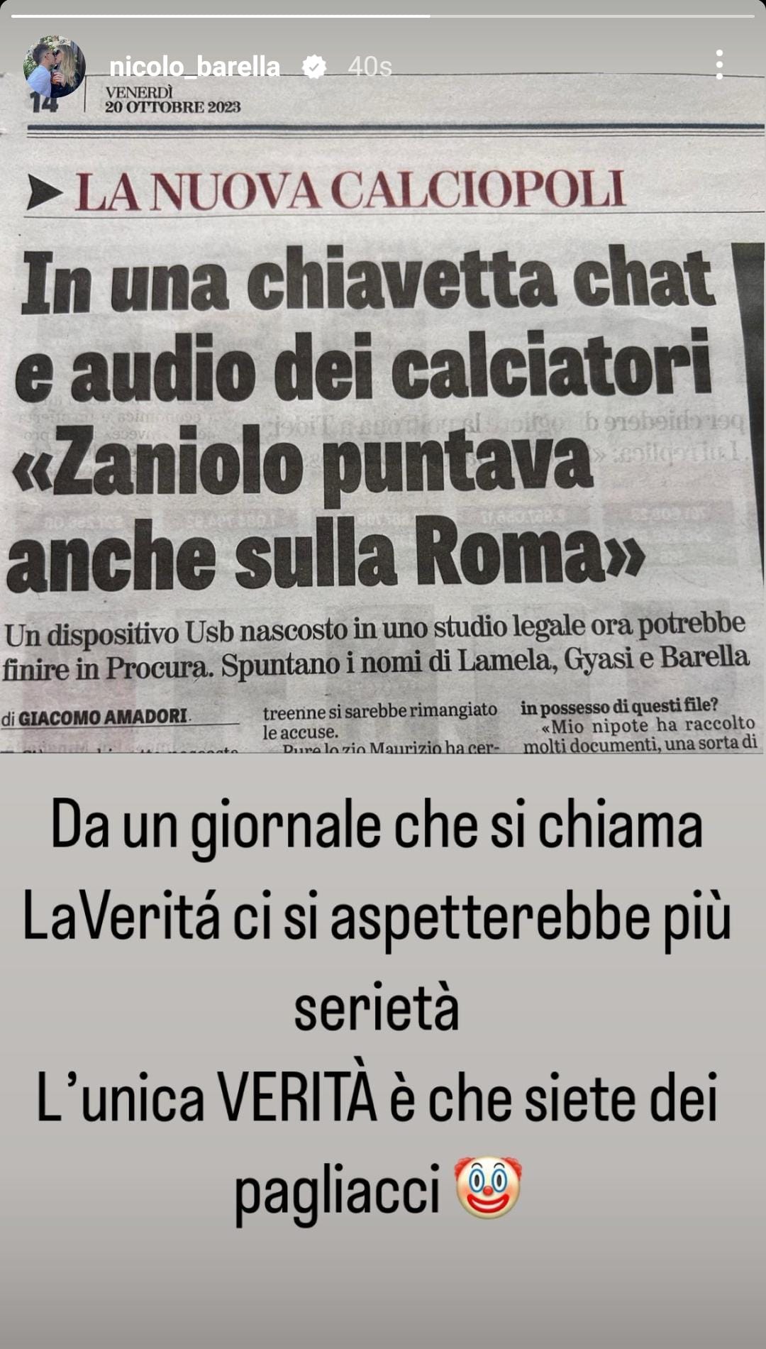 Nicolò Barella ha voluto rispondere con una storia su Instagram alle voci delle ultime ore sul caso scommesse in cui in tanti lo vedono coinvolto