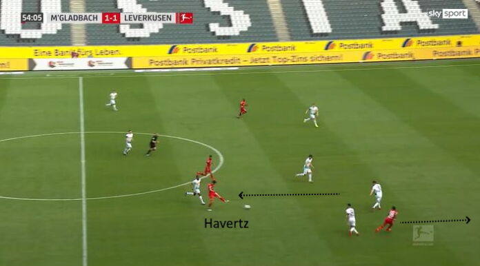 Un esempio è l’azione del rigore procurato (e trasformato da Havertz stesso). Come si vede nella slide sopra, il 29 viene incontro mentre Bellarabi va ad aggredire la profondità. Havertz lo manda poi solo davanti alla porta con un preciso filtrante.