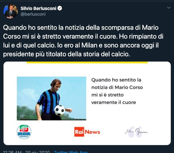 Berlusconi ricorda Mario Corso. Ma scoppia la polemica sul tweet