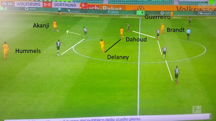 Il Borussia Dortmund palleggia da dietro, ma Akanji non ha soluzioni di passaggio. Dahoud e Delaney sono schermati, mentre Brandt è troppo lontano. Il difensore è così costretto a tornare da Burki, con il 442 del Wolfsburg ben messo in fase difensiva.
