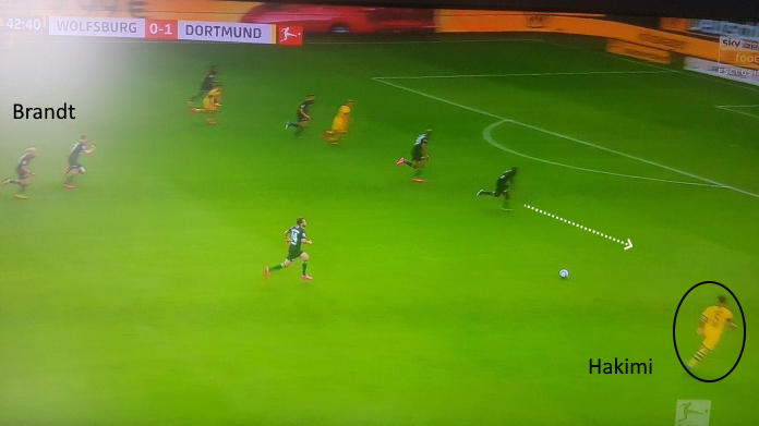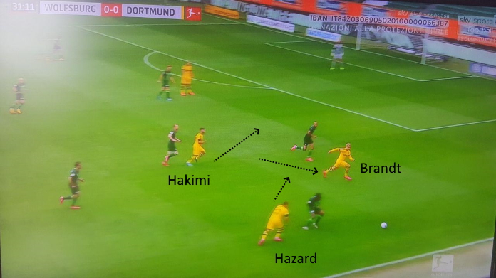 Gli ospiti riescono a trovare più facilmente Brandt tra le linee: il tedesco, da lì, apre velocemente il gioco in fascia, soprattutto a destra, dove Hakimi e Hazard si trovano in superiorità numerica. Il Wolsfburg deve così costantemente rincorrere gli avversari in fascia, con l’esterno marocchino che – servito in corsa – ha sempre tanto spazio per puntare l’avversario.