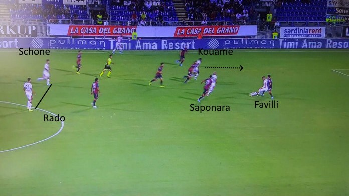 Quando si verticalizza su di loro, devono saper combinare bene con uno-due veloci per andare verso la porta. Un esempio nella slide sopra: Kouame la dà e Favilli e va subito ad aggredire la profondità, con l’attaccante pronto a ridargliela. Da notare la loro vicinanza.