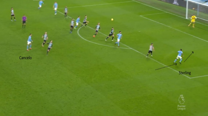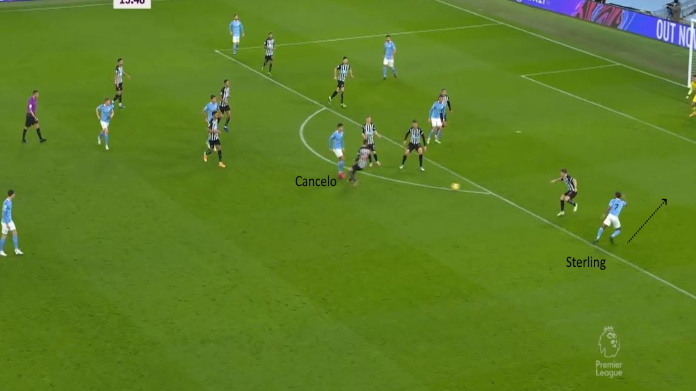 In altre circostanze, lo abbiamo invece visto stringersi molto dentro al campo, in una posizione praticamente da trequartista/mezzala. Lì sono avvenute le giocate più belle della partita. Cancelo ha innescato Sterling, che aggrediva la profondità a destra, con palloni da rifinitori top, servendo bene l’inglese in corsa. Il City è così riuscito ad attaccare bene la (bassa) linea difensiva del Newcastle, trovando l’uomo alle spalle.