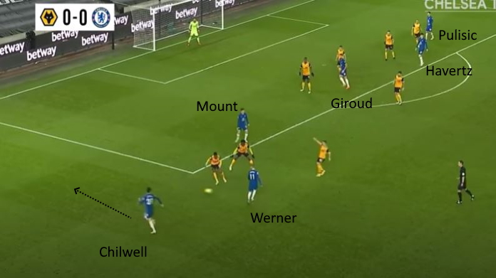Il gol di Giroud su assist di Chilwell. Da notare il triangolo a sinistra tra ala, terzino e mezzala. Come si vede, entrambi le mezzali (Havertz e Mount) sono molto alte: ciò permetter di riempire sempre bene l’area di rigore, ma provoca anche rischi nelle ripartenze rivali.