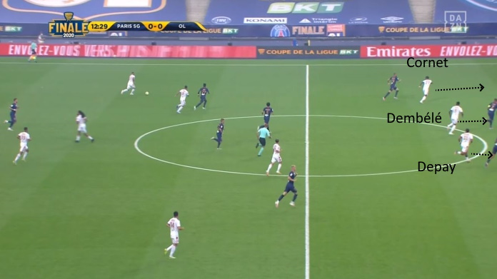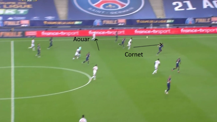 Sarebbe però ingeneroso spacciare l’OL come una squadra che si limita a verticalizzare per le punte non appena ne ha l’occasione. Contro il PSG, i francesi hanno allargato bene e con costanza il gioco, con buone parte della manovra offensiva che è passata sui quinti (Dubois e Cornet). I cambi di campo hanno trovato con continuità gli esterni alti, che sono potuti andare diverse volte sul fondo. Cornet in particolare ha punto molto sul lato mancino, con i compagni che sono stati molto bravi a generargli spazi da aggredire. L’ivoriano ha totalizzato 2 dribbling e 3 passaggi chiave, generando parecchi pericoli a sinistra.