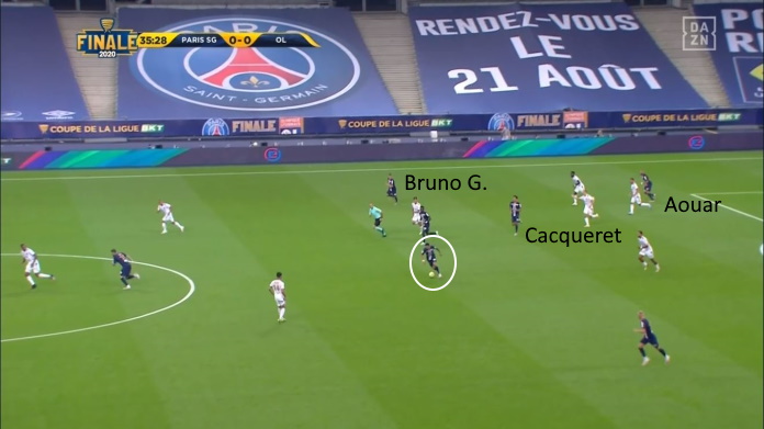 Dopo aver perso un pallone nei pressi dell’area rivale, il Lione si fa trovare lunghissimo nella ripartenza del PSG. Come si vede, Aouar e Cacqueret (le due mezzali) occupano una posizione molto alta. Considerando che i 3 difensori non accorciavano molto, c’era costantemente tanto spazio in mezzo quando il PSG ripartiva.