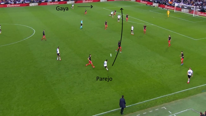 Parejo, invece, è il principale regista della squadra. Oltre a essere un leader insostituibile all’interno del gruppo, si tratta di un giocatore che catalizza su di sé buona parte della manovra. Soprattutto nell’uscita da dietro, visto che Parejo è per distacco il calciatore che effettua più passaggi ogni 90′: ben 65. Oltre alla grande pulizia tecnica sul breve, svetta per i cambi di gioco: ne azzecca 6.9 ogni 90′, record nella squadra. Un esempio nella slide sotto, in cui effettua un chirurgico cambio di campo che serve Gaya in profondità. Qualità fondamentale in una squadra che, come abbiamo visto, attacca soprattutto sfruttando le fasce