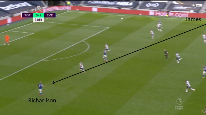 Uno dei molti cambi di campo millimetrici di James, che trova Richarlison sul lato debole. Il brasiliano può così puntare il terzino rivale.