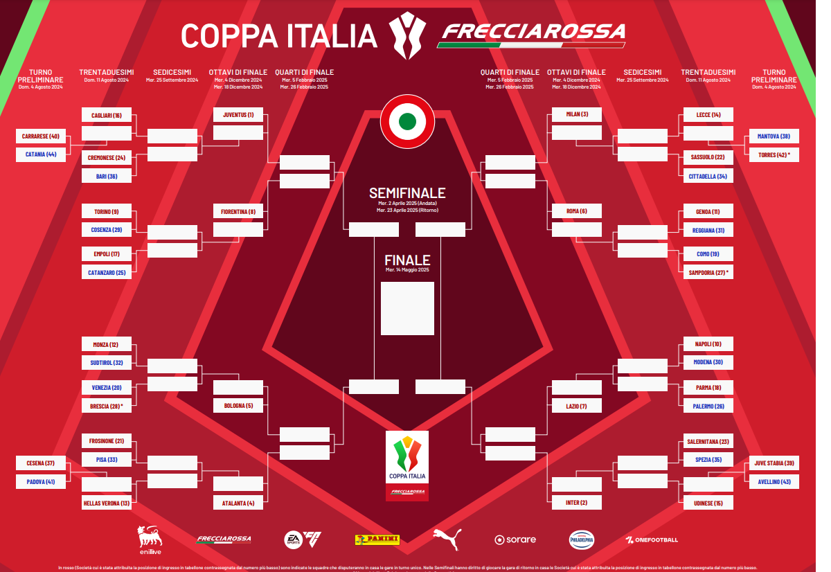 Arrivato proprio pochi minuti fa il tabellone completo della Coppa Italia 2024 2025. Ecco gli incontri completi.