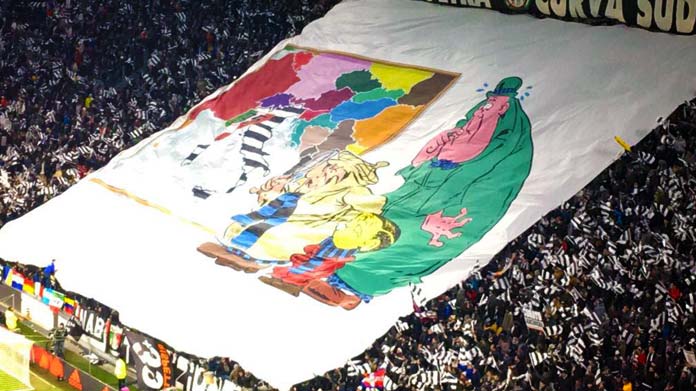 Poco prima della partita tra Juventus e Inter, i tifosi della Juventus hanno mostrato la loro coreografia. Nella curva bianconera è apparso uno striscione enorme con tre persone con la sciarpa nerazzurra e una cartina dell’Europa. Nella mappa l‘Italia è dipinta di bianco e di nero e campeggia uno Scudetto enorme nei pressi di Torino, sullo stemma si legge un gigantesco ’35’. Oltre al disegno, si legge anche uno striscione poco più sopra: «Dice il saggio, la Cina è vicina, l’Italia è un miraggio».