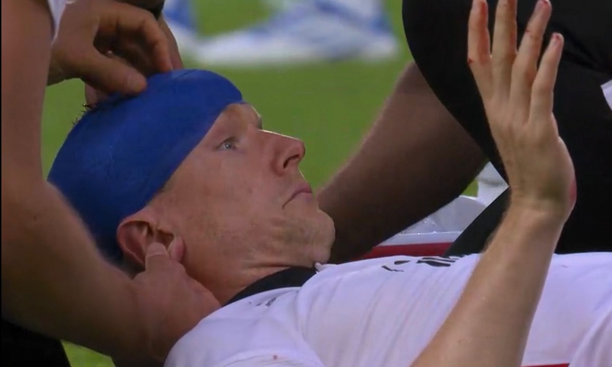 Sanguinante, il giocatore tedesco, è rimasto a terra soccorso dai sanitari che gli hanno applicato una vistosa benda.