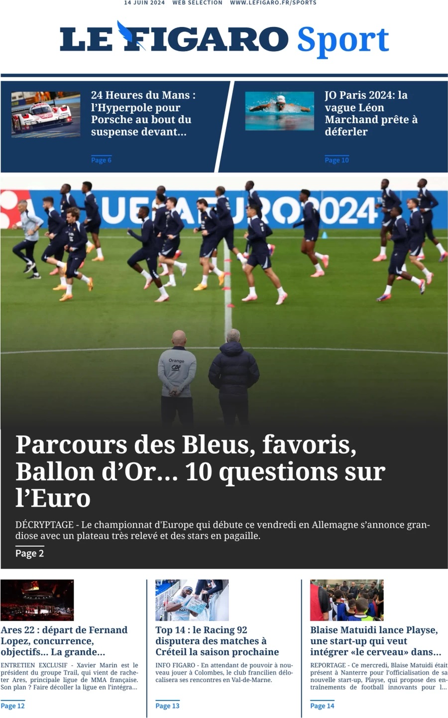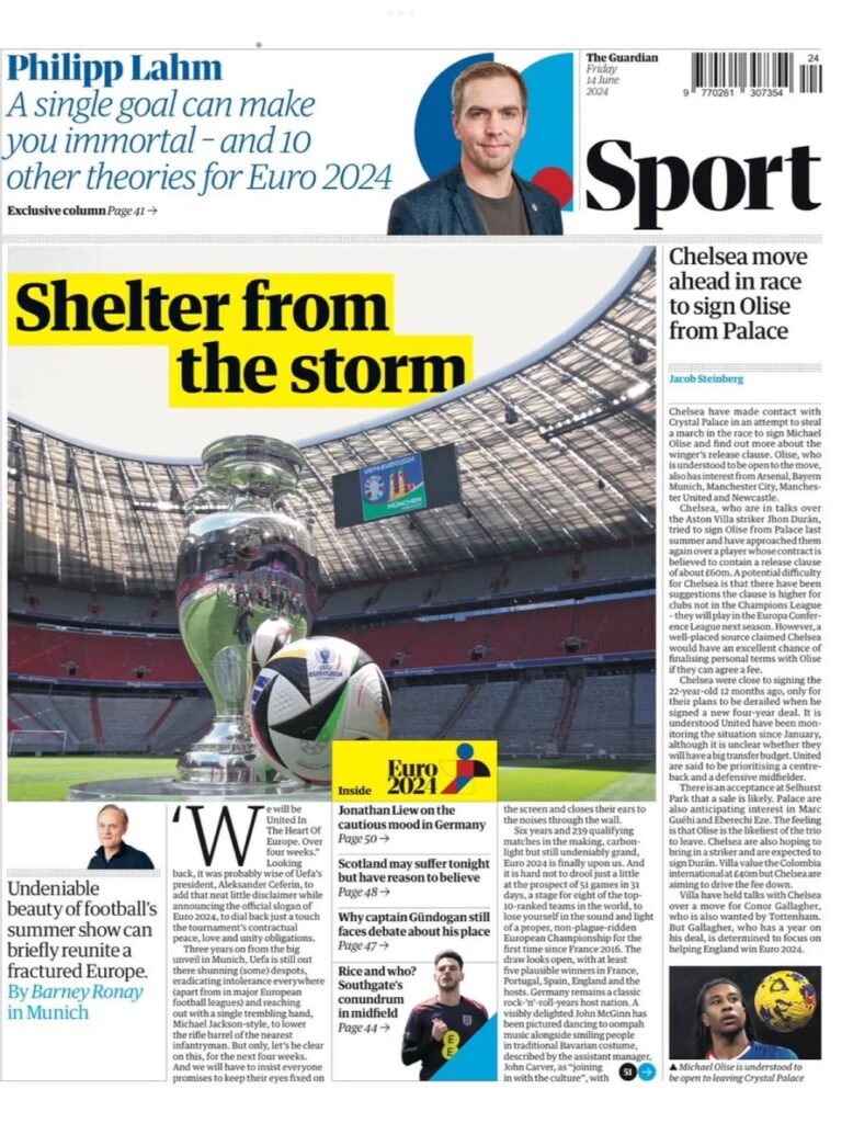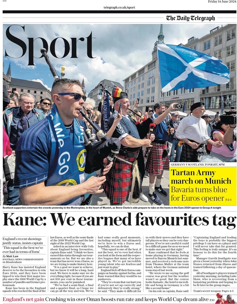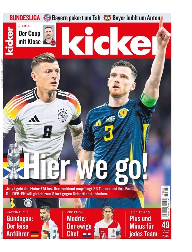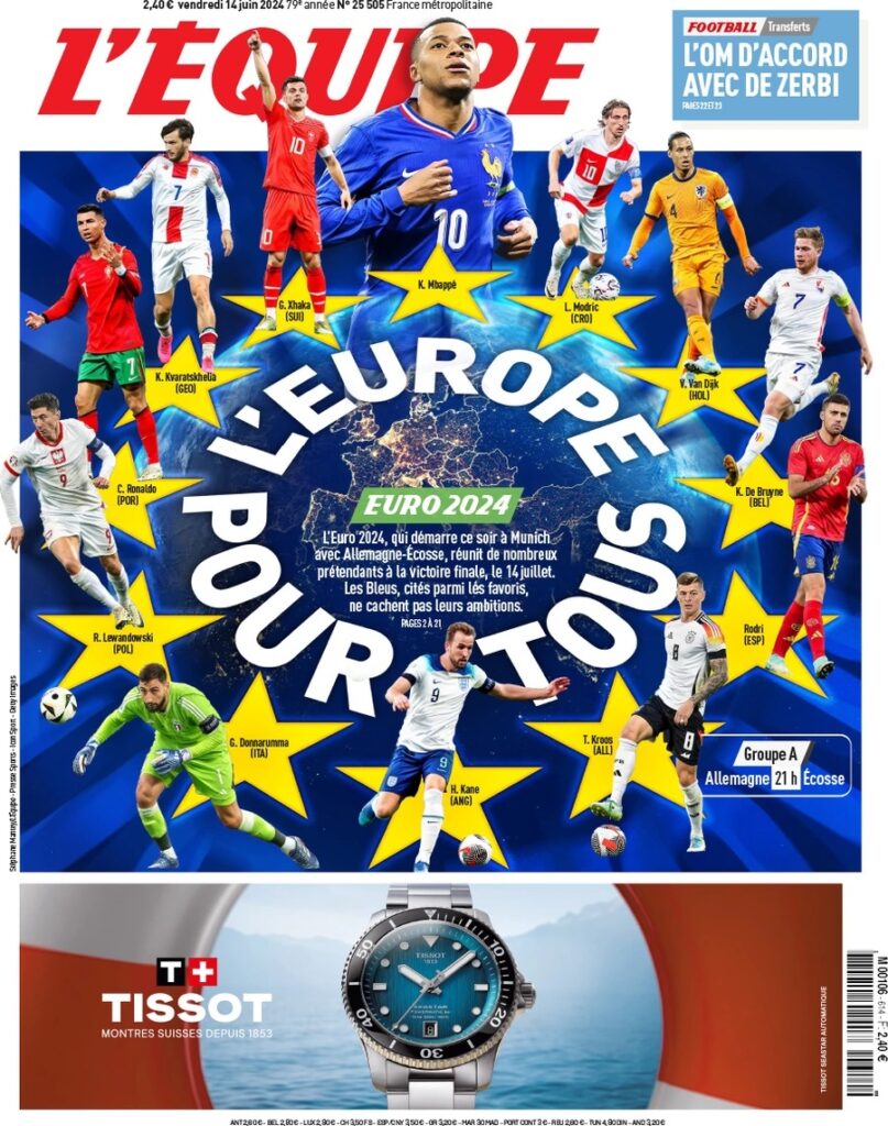 Alle 21.00 di questo sera iniziano gli Europei 2024 con Germania-Scozia. L’attesa è finita e in tutto il vecchio continente l’attenzione sarà sulle squadre che si contenderanno la vittoria finale. Ecco le prime pagine dei principali quotidiani stranieri.