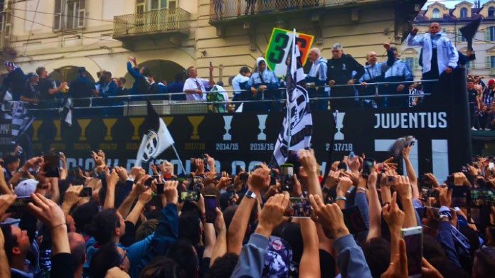 Piazza Castello via via si va riempiendo per la festa della Juventus, vincitrice del settimo Scudetto di fila. Tanti i supporters bianconeri che hanno voluto togliersi più di un sassolino dalle scarpe, intonando cori e sfottò, ma anche affiggendo striscioni, contro le altre squadre. Inter, Torino e Napoli su tutte. Vedere i tanti video e foto che girano in rete per credere. Gettonatissimo il coro “chi non canta neroazzurro è”, memore di quanto accaduto anni prima: dopo il terremoto Calciopoli che costò la retrocessione alla società piemontese, fu l’Inter a giovarne maggiormente in termini di vittorie.
