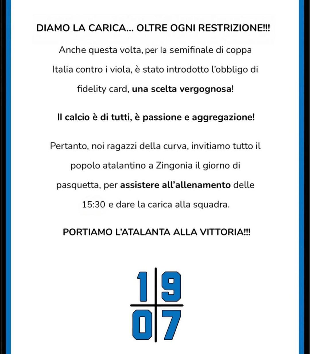 I ragazzi della Curva Nord infatti hanno stilato un comunicato che invitava tutti a pasquetta presso il Centro Bortolotti di Zingonia per caricare Lookman e compagni durante l’allenamento del lunedì, prima della partenza della squadra per Firenze.