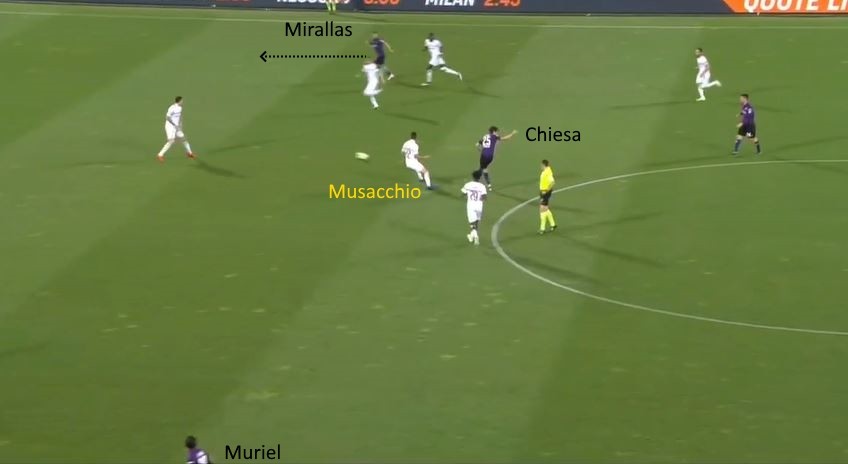 Ha infatti iniziato a svariare molto di più agendo dentro al campo. Sopra lo si può vedere: viene incontro, attira Musacchio e serve Mirallas in profondità.