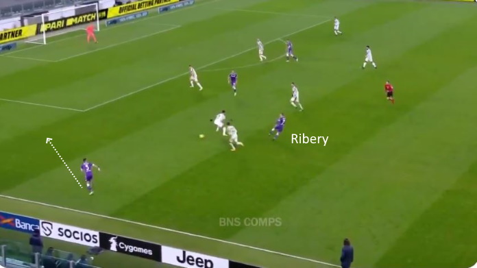 Ribery riceve e, con uno strepitoso controllo orientato, supera Bentancur. La Fiorentina buca la Juve centralmente.