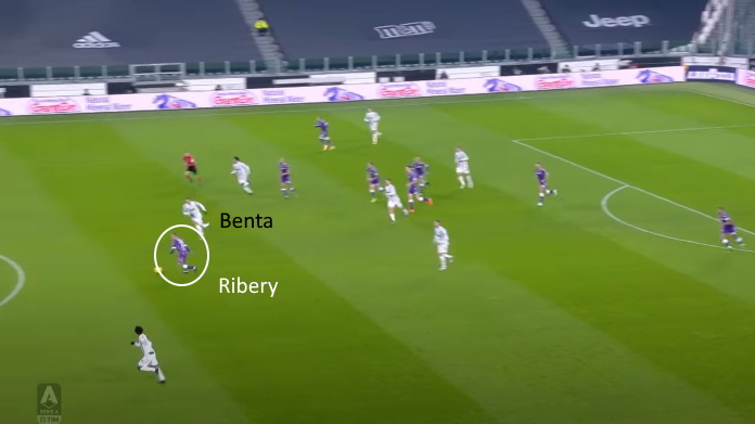 Ribery era particolarmente abile nel ricevere sul centro-sinistra, tra Bentancur e Chiesa. Formava triangoli interessanti con Castrovilli e Biraghi, con la Fiorentina che riusciva a trovare quasi sempre superiorità posizionale. Il numero 7 attirava tanti giocatori su di sé, di conseguenza si creavano spazi che i compagni andavano bene a riempire.