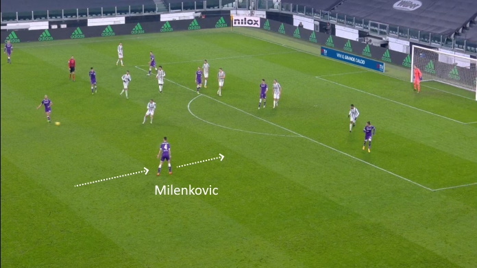 Una delle molte situazioni in cui la Juve si difende bassissima, costretta dal palleggio della Fiorentina. I viola hanno passato molto tempo nella trequarti bianconera. Qui la palla va da sinistra (il lato di Ribery) verso destra, con Milenkovic che si è sganciato in avanti.