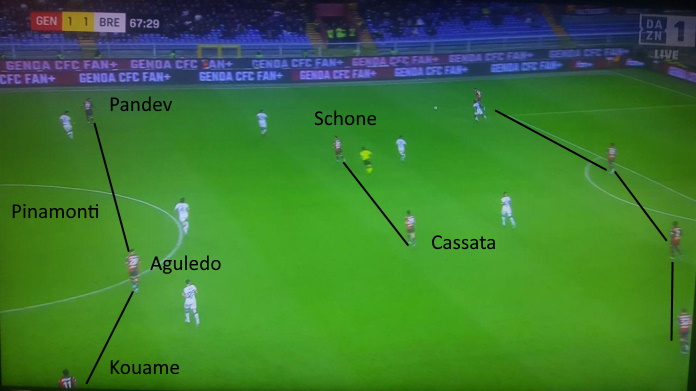 Si vede nella slide sopra. 4231 con Cassata e Schone in mezzo. Alle spalle di Pinamonti, giocano Agudelo, Kouame e Pandeva. Quest’assetto tattico ha dato molta più profondità e pericolosità ai padroni di casa.