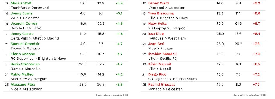 Stabilire a priori, ancora ad inizio stagione, i migliori ed i peggiori acquisti dell’ultima sessione di calciomercato estiva è impresa quantomeno ardua. L’Istituto di Statistica Internazionale del Calcio, il CIES, ci ha però provando basandosi su dati empirici: l’osservatorio calcistico elvetico ha stilato due classifiche distinte. Da una parte quella dei migliori acquisti in rapporto qualità/prezzo per i club acquirenti, sarebbe a dire i migliori affari in entrata. Dall’altra invece quella delle migliori cessioni in rapporto qualità/prezzo, ovvero i migliori affari… ma per i club cedenti. Non mancano ovviamente anche moltissimi affari di club italiani.
