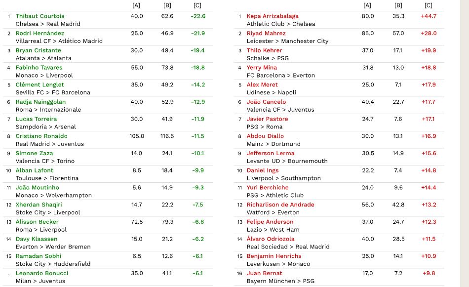 N. B. Il primo numero (A) si riferisce al prezzo pagato per il giocatore, il secondo (B) al suo valore stimato al momento dell’acquisto, mentre il terzo (C) costituisce la differenza dei due valori