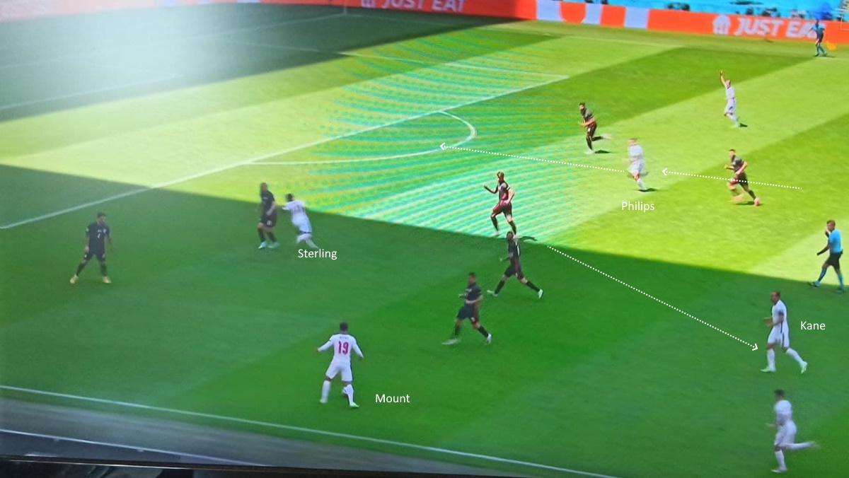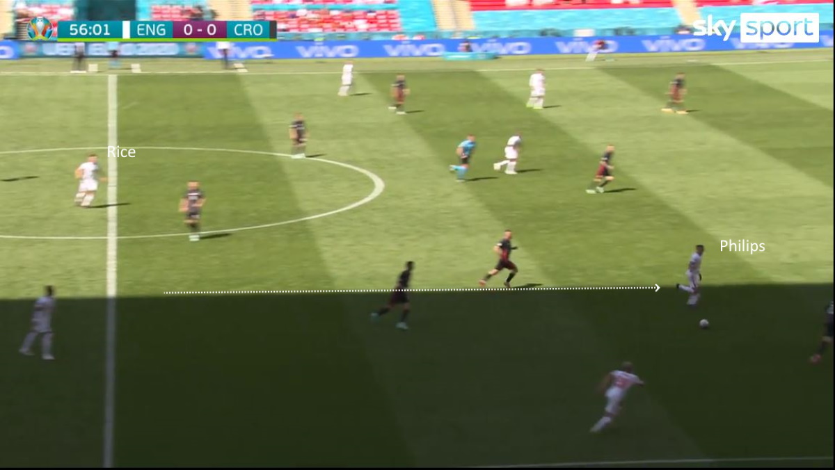 In effetti, sono stati interessanti i compiti del centrocampista del Leeds, uno dei protagonisti della squadra di Bielsa (tecnico che ha saputo valorizzarlo alla grande). Se nel suo club agisce più basso alla difesa dove gestisce una valanga di palloni (distinguendosi per millimetrici cambi di gioco e passaggi lunghi), nel match di ieri aveva compiti diversi. Rice rimaneva più basso e bloccato, mentre Philips si buttava in avanti e attaccava gli spazi, più da incursore/mezzala box to box. Oltre all’azione del gol, sono stati parecchi i suoi smarcamenti offensivi. Ha toccato una valanga di palloni anche in zone avanzate del campo, dimostrando grande importanza tattica.