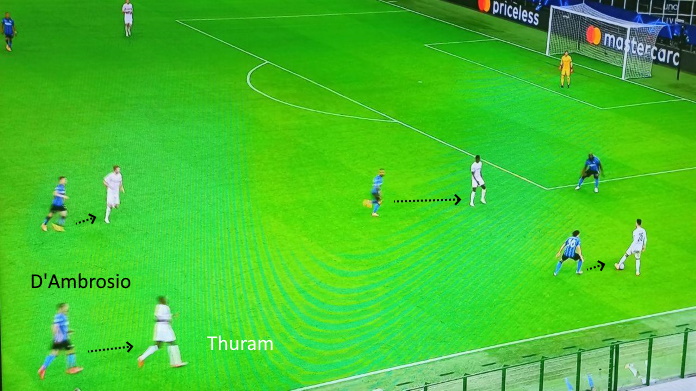 Al contrario, nel secondo tempo gli spazi sono aumentati sensibilmente. Ancora una volta (si era già notato nel derby), l’Inter di Conte si è allungata molto, con le marcature preventive che si sono rivelate un grosso problema. Dopo ogni palla persa, le punte dei tedeschi avevano spazio per ricevere ed aggredire poi la profondità.