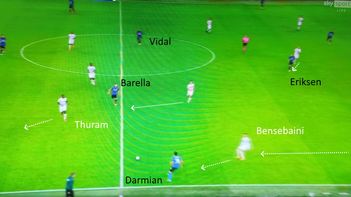 In particolare, D’Ambrosio ha fatto una grande prestazione su Marcus Thuram, lo seguiva in zone profonde del campo quando il francese arretrava la propria posizione. Il Borussia non è quindi riuscito a innescare bene i 4 attaccanti, i quali hanno avuto pochi spazi: il grosso della pericolosità del Gladbach si basa sulle combinazioni tra Plea, Thuram, Embolo e Hoffman. Neutralizzati loro, i tedeschi sono molto sterili, soprattutto quando affrontano una difesa schierata.