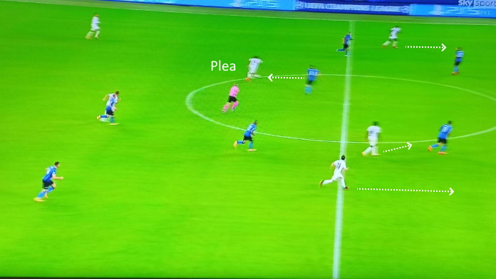 Un esempio nella slide sopra. Dopo che i tedeschi recuperano il possesso, riescono a verticalizzare per Plea, come De Vrij in ritardo nell’accorciare su di lui. Il Gladbach può quindi attaccare in ripartenza, con 3 giocatori pronti ad aggredire la profondità. Questi spazi erano mancati nella prima frazione, l’Inter riusciva più facilmente a recuperare palla.