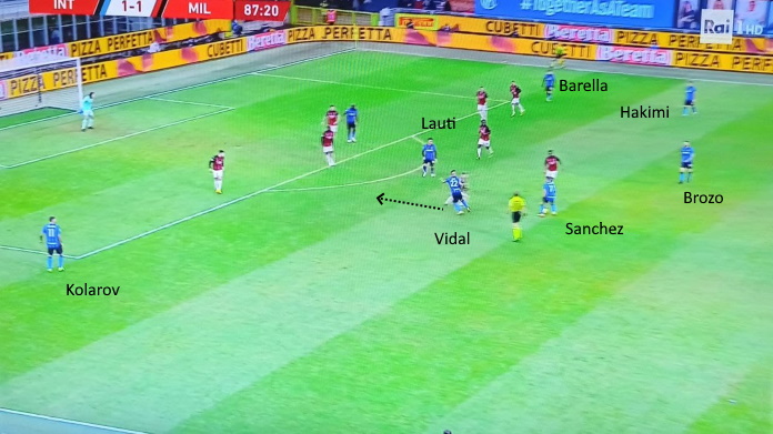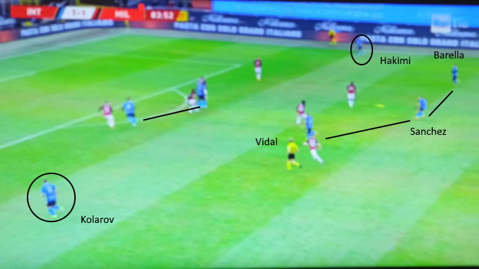 Nell’azione sopra, Vidal va al tiro dal limite dopo aver raccolto la sponda di Lautaro, servito dal numero 7 nerazzurro.