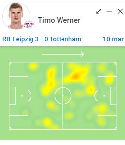 Il tedesco, come si vede nella Heat Map sopra, ama giocare fronte alla porta. Inoltre, per sfruttare la sua falcata e le sue doti atletiche, parte largo (solitamente a sinistra) da una posizione molto defilata. Tant’è che è Schick la punta che occupa il centro dell’attacco, mentre Werner si muove tantissimo in orizzontale. Insomma, nel caso arrivasse il cannoniere del Lipsia, Conte dovrebbe cambiare molto il modo di giocare.