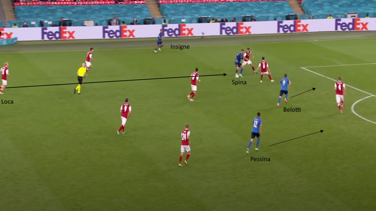 Locatelli verticalizza molto bene per Spinazzola, trovato bene tra le linee: anche in questo caso, il romanista riceve dentro al campo, con Insigne che invece è più aperto. Dopo la ricezione di Spinazzola, che attira su di sé praticamente 3 giocatori austriaci, sono vitali i movimenti di Pessina e Belotti. Entrambi attaccano bene l’area di rigore attirando su di sé i difensori,  con Alaba (il terzino sinistro) che stringe molto verso il centro perché costretto a seguire Pessina. Di conseguenza, si crea lo spazio per Chiesa, che è liberissimo di ricevere lo splendido passaggio di Spinazzola, segnando poi con un bellissimo tiro mancino. Un’azione plasmata proprio grazie alla caratteristiche dei giocatori entrati dalla panchina.