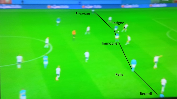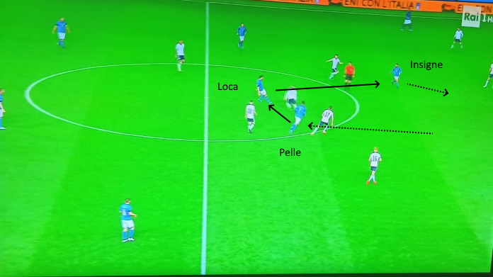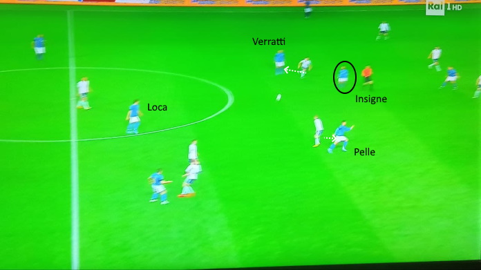 Due delle molte situazioni in cui l’Italia trova Insigne tra le linee. Decisivo il contributo di Verratti, più alto di Locatelli, che attira la mezzala su di se.