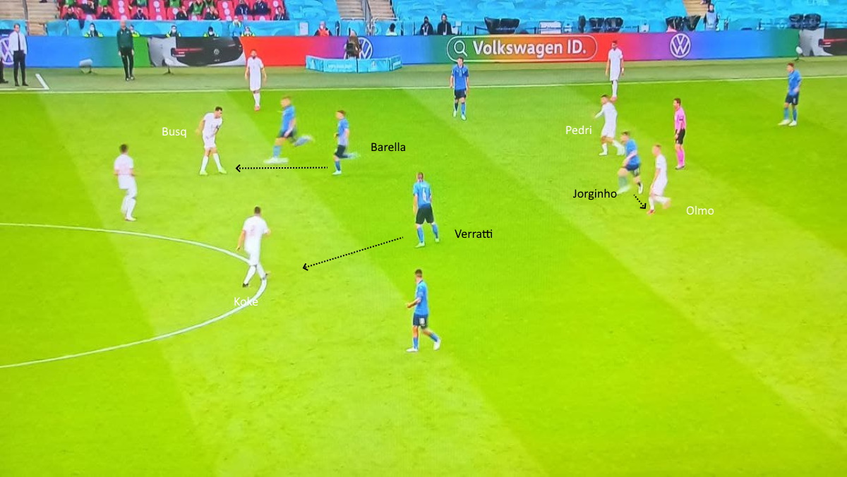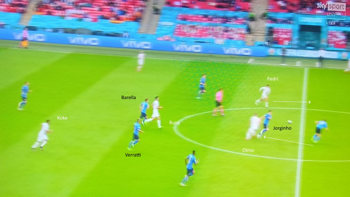 Le (sorprendenti) scelte tattiche di Luis Enrique hanno consentito alla Spagna di essere in costante superiorità numerica in mezzo, trovando l’uomo libero. L’allenatore ha infatti rinunciato a Morata, schierando Dani Olmo dal primo minuto, con Oyarzabal e Ferran Torres ai suoi lati. I movimenti da “falso 9” del giocatore del Lipsia davano continue ricezioni centrali a una Spagna che sfondava sovente per vie interne. Chiellini e Bonucci raramente accorciavano su di lui, di conseguenza la Spagna si trovava in superiorità numerica a centrocampo.