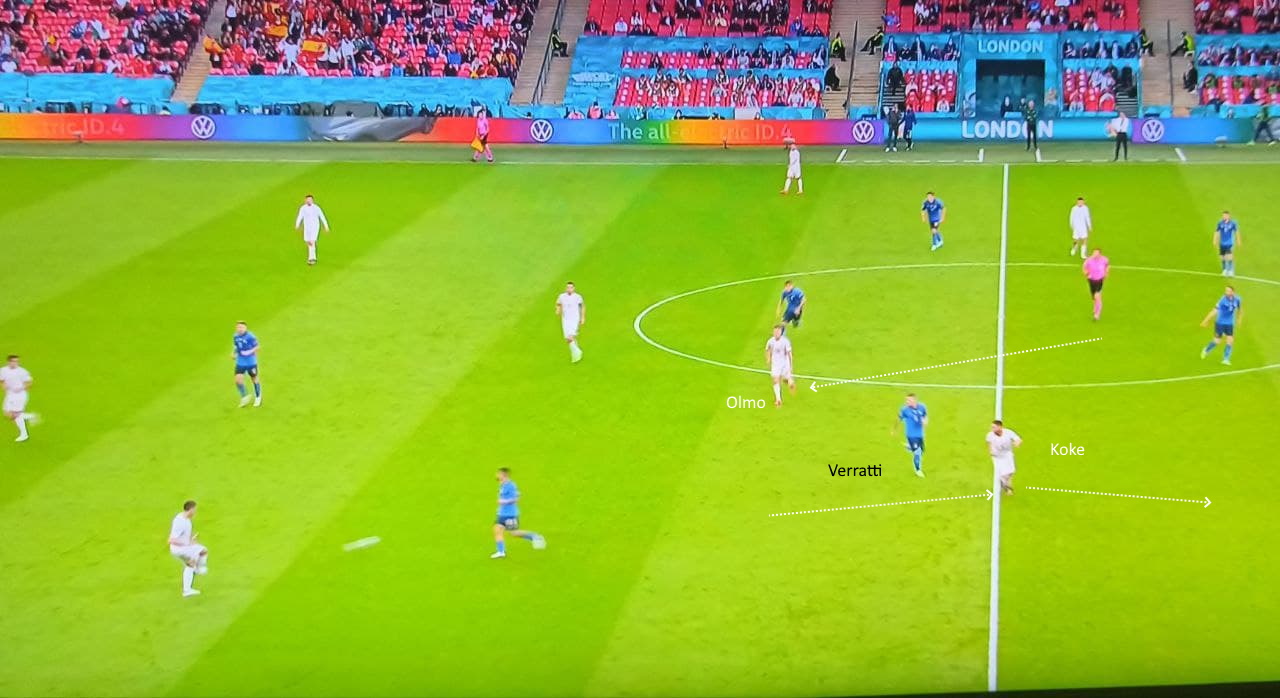 Un’altra situazione in cui la Spagna trova Olmo e manipola così il pressing azzurro. Prezioso il movimento di Koke.
