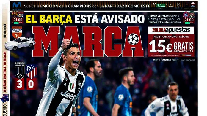 Meno risalto alla partita di ieri l’hanno dato invece i giornali catalani, concentrati più che altro sulla sfida di stasera del Barcellona contro il Lione. Sport titola semplicemente: «Cristiano abbatte l’Atletico». El Mundo Deportivo invece, a tre quarti di copertina, scrive: «Cristiano spezza il sogno dell’Atletico Madrid».