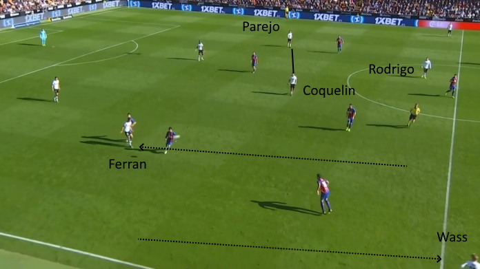 Nella slide sopra si vede una giocata interessante. Viene incontro al difensore mentre Wass si alza, attaccando lo spazio alle spalle del terzino avversario. Con un preciso lancio, Ferran lancia il compagno verso la porta.