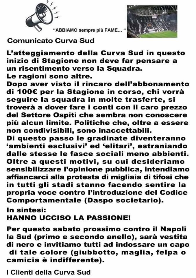 Come se non bastasse, gli ultras si scagliano insieme ad altri tifosi d’Italia contro l’introduzione del Codice Comportamentale, il cosiddetto Daspo Societario. Per questi motivi, i tifosi hanno indetto una protesta per il big match casalingo contro il Napoli, chiedendo a tutti gli abbonati di indossare un capo d’abbigliamento nero, quasi a simboleggiare un lutto. Il lutto di non potersi più permettere di sostenere la propria squadra, verso un tifo che sembra andare sempre di più verso un élite.