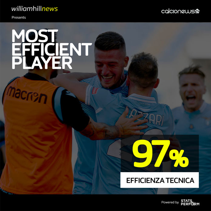 Tutto ciò a testimonianza di una partita tesa e nervosa, dove però è emerso ancora una volta il talento cristallino di Sergej Milinkovic-Savic, autore del gol del definitivo pareggio. La rete del “Sergente” va a coronare una prestazione maiuscola del centrocampista biancoceleste, il più incisivo sul rettangolo di gioco, con un Impact Factor del 16%. Il serbo è dominante durante tutta la partita, abbinando come sempre ad una tecnica notevole (indice di efficienza tecnica del 97%) una fisicità devastante che, con una percentuale di efficienza fisica del 94%, lo vede il giocatore con più duelli all’attivo durante il match, sia in generale (16) che nel gioco aereo (4).
