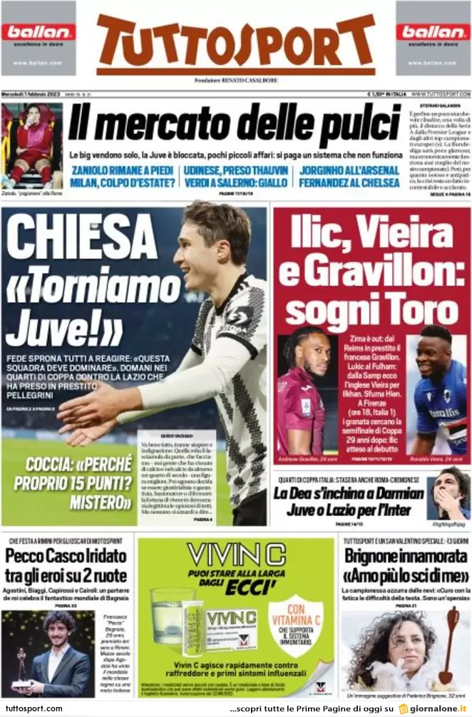 Le prime pagine dei quotidiani sportivi – 01 febbraio