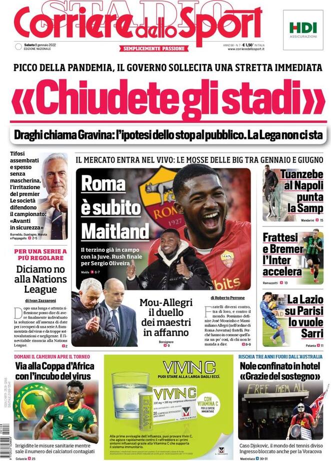 Le prime pagine dei quotidiani sportivi di oggi – 8 gennaio