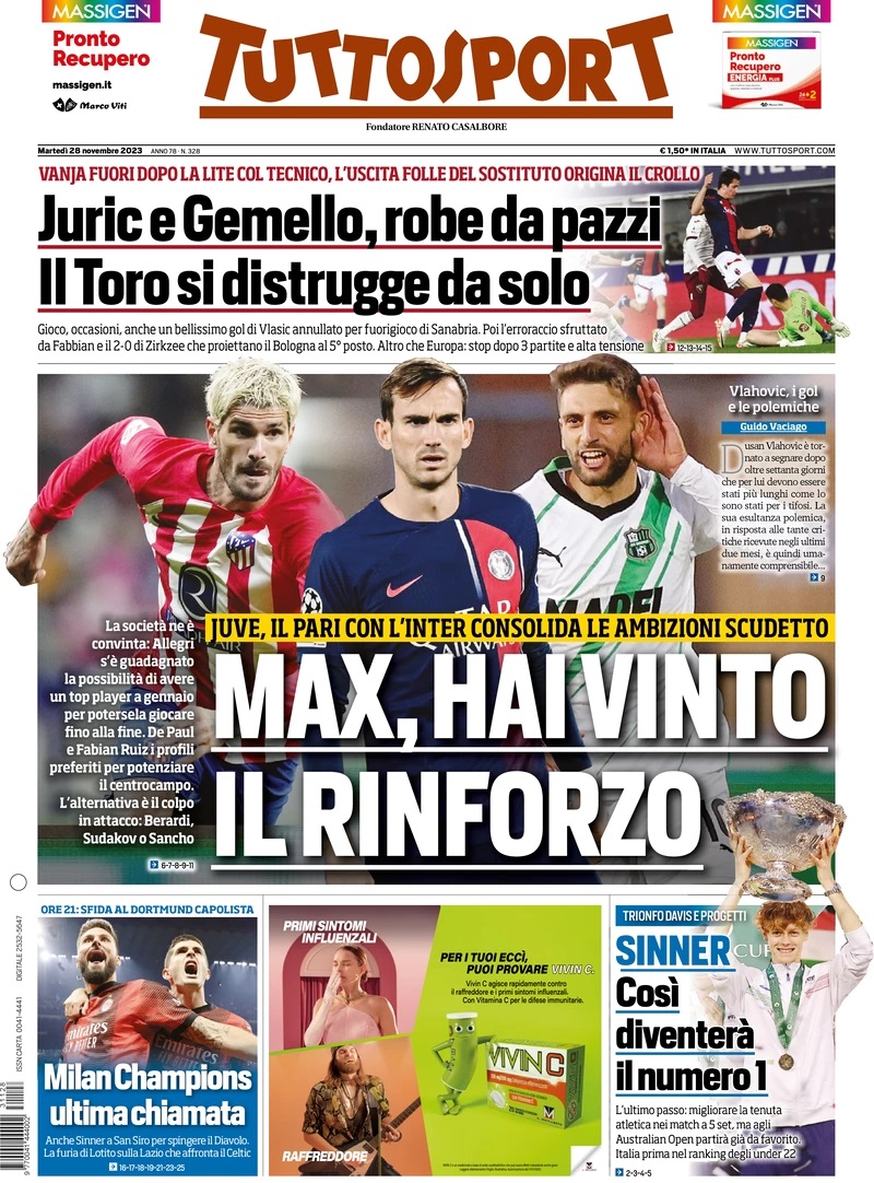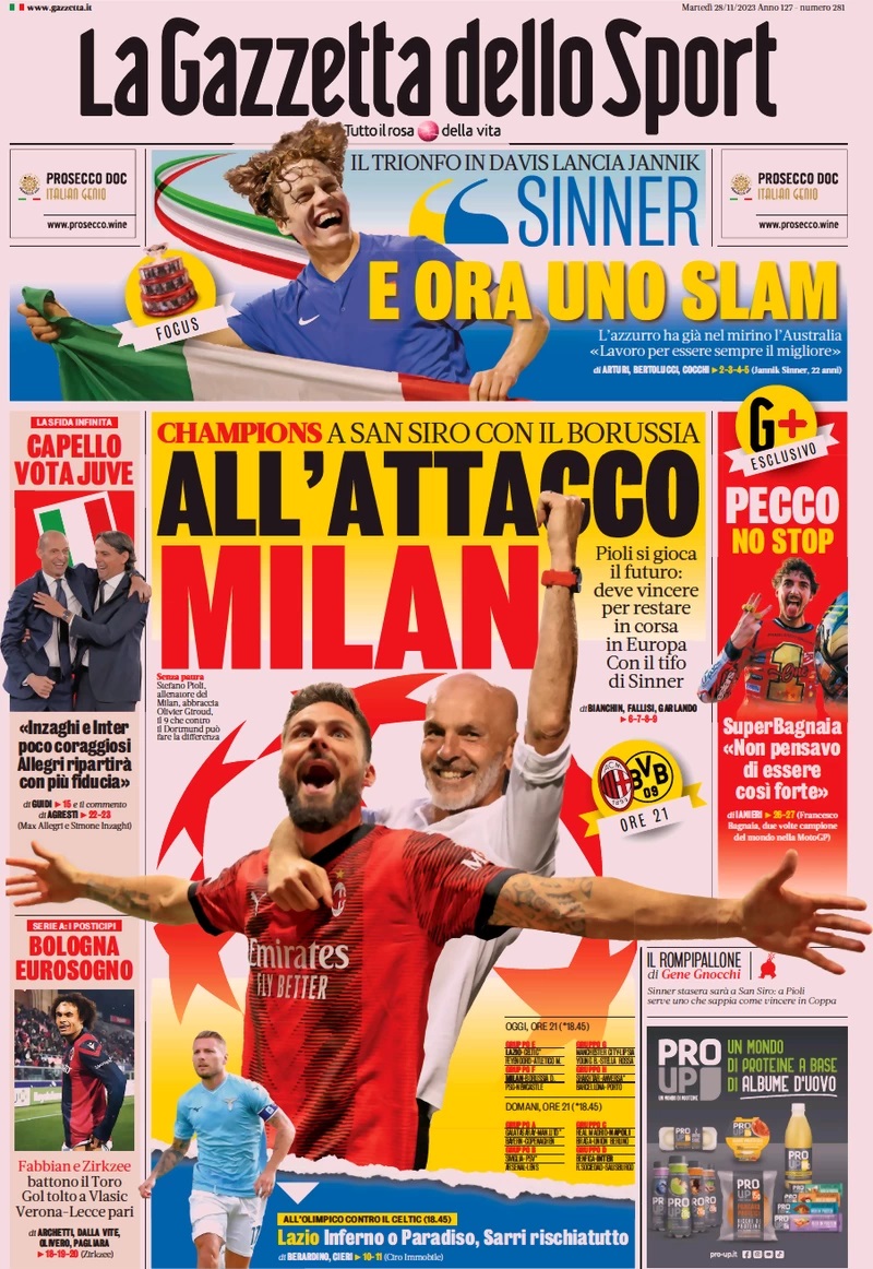 Le Prime Pagine Sportive Nazionali – 28 novembre